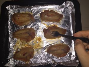 隔十分钟把鸡翅拿出来,用叉子扎小孔。其实可以在腌鸡翅的时候给刀,但是我hold不住鸡翅所以放弃了…