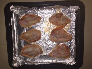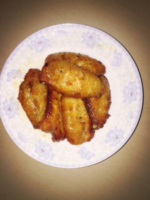 翅中用烤肉料,料酒,水腌制二十个小时。烤盘铺上锡纸,翅中放上去。烤箱上下管200度加热风循环预热五分钟后把鸡翅放进去。