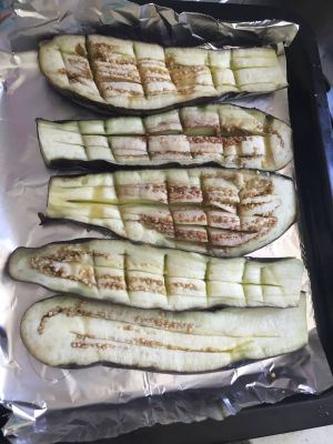 茄子切开,中间划开(方便入味),我之前忘记划开了,蒸熟后不太好操作,蒸熟,一定不能少了这一步,不然烤不软!