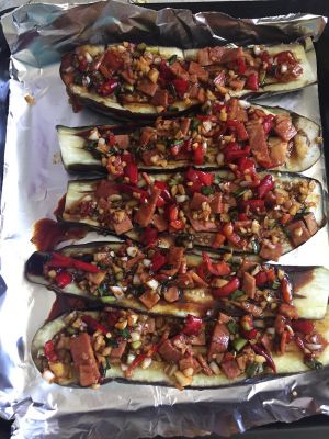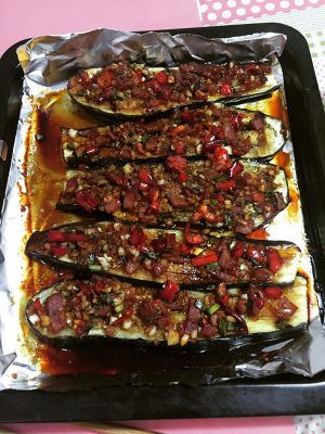 茄子烤好后用筷子小心的把茄子翻过来,把刚刚炒好的料摆到茄子上。再放入烤箱里180度烤3分钟就行。
