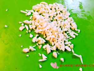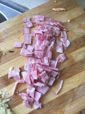 大蒜切碎,进油锅炒香(忘记拍照片了),培根切成小粒!一起放进调料碗里!