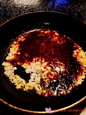 冷锅冷油五分热,将蒜末下锅爆香,将酱汁倒入