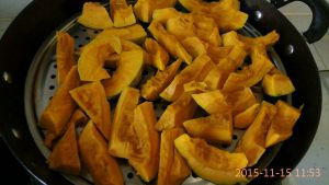 好快!南瓜熟了,先吃为快,超甜,攒劲的很(此处新疆话,就是特别特别特歹,哈哈,歹就是好),南瓜是婆婆家种的,我在窗台上都晒了一个月了,所以就算直接放篦子蒸出来也没多少水,就是一个字,甜,面!自己做饭的好处就是可以边做边吃