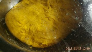 3:南瓜熟了'放凉'捣泥'加点糖'一点点'然后加入糯米粉和面粉'按1:1加入'这样的话'做出来的南瓜饼不会太软太硬'