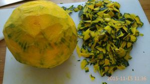 砍南瓜皮!是的,是砍!因为南瓜皮很硬,现在砍了蒸熟烫的时候就不用下手处理了!红色皮和绿色皮的南瓜都可以!