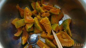 南瓜去皮,去籽蒸熟。加糖压碎。