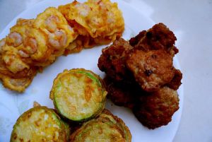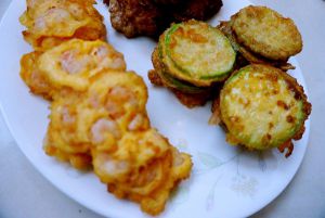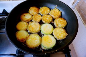 平底锅里倒入油,把裹好鸡蛋液的角瓜片放进去,两面煎至金黄色就行了。火小一点,慢慢煎,如可以用筷子扎角瓜饼的的边缘,如果能轻易扎透,就是熟了。