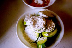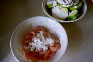 角瓜上抹上淀粉。可以找一个大盆,洒上淀粉,颠几下就抹均匀了...