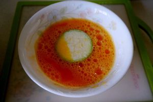 鸡蛋打散,放入少量的盐,抹好淀粉的角瓜放进去完全浸泡。