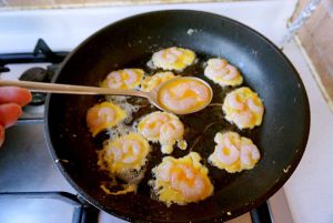 平底锅放入油,用勺子盛上两三个虾仁放在锅上上,两面煎成金黄色就行了,虾仁很容易熟,颜色变了就行了!