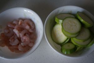 韩国人把角瓜叫成南瓜,所以南瓜饼实际上就是角瓜饼。角瓜一根切成厚片,第一次做可以切的薄一点。虾仁买的袋装248克的,洗净控干即可。