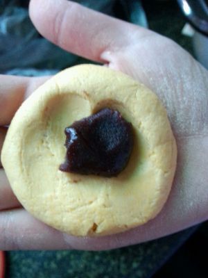 捏成圆片状,中间放入豆沙,再将另一个盖在上面