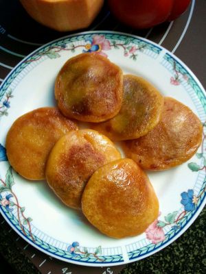 平底锅置小火,加少许油,放入做好的南瓜饼,煎至两面略金黄即可。