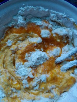 将面粉,糯米粉,南瓜糊,糖放一起搅拌均匀。