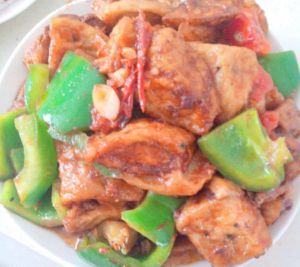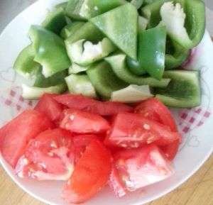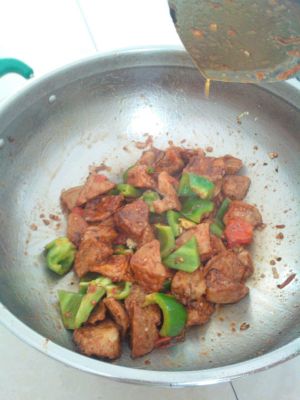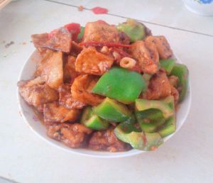 再然后加青椒块,中途加盐,白糖,生抽,最后蒜末,鸡精出锅。
