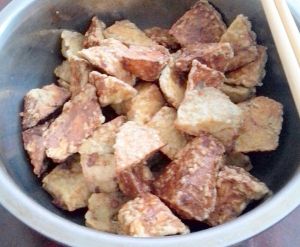 放入茄子块,炒到茄子和土豆变成金黄色,捞出备用