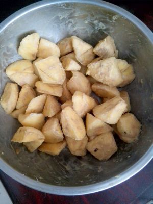 把食材都切滚刀块如图,姜,蒜切小粒(茄子切好用盐水浸泡防止氧化变黑)