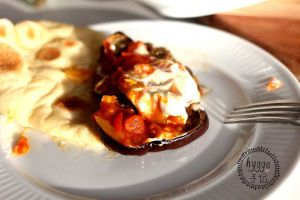 用一个大盘子,第一层铺茄子,第二层放西红柿酱,第三层放酸奶,最后点缀薄荷叶就完成了