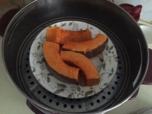 蒸南瓜,也可微波炉叮熟!最好加保鲜膜!蒸好后记得滤干水!