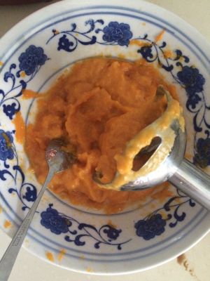蒸好的南瓜去皮捣烂,与黄油糖粉混合。 此时南瓜泥里面会有纤维,口感比较粗糙,不喜欢的人可以把纤维滤掉