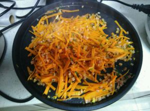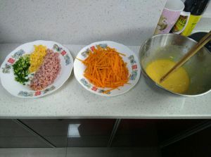 准备食材,南瓜切丝,(我的刀法太差了)培根,葱切了,咸蛋黄撵碎。