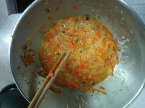 将糯米粉和低粉混入南瓜泥中。喜欢吃软软的南瓜饼的人可以多加糯米粉,少加或不加面粉。