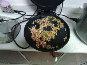 煎饼炉刷油加热,倒入培根,蛋黄,小葱炒出香味。