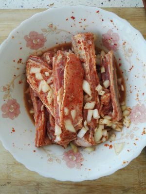 把所有调料放到盆中,把羊排腌制两个小时以上,有时间隔夜最好