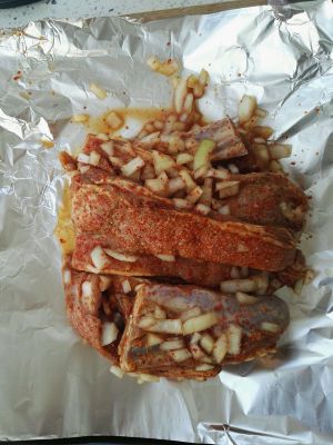 放在一张新的锡纸撒上辣椒面和孜然粉。在烤箱里200度烤制十五分钟。