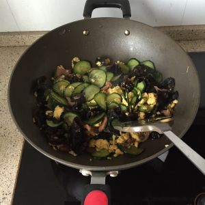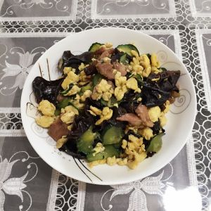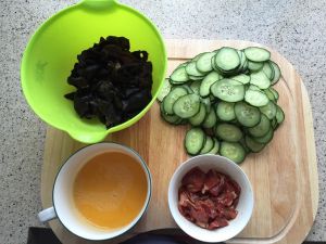 备料: 1、黄瓜切片 2、木耳泡好后洗净去根 3、鸡蛋打散加少量水和盐 4、肉切片加入料酒、酱油及淀粉腌制5分钟。