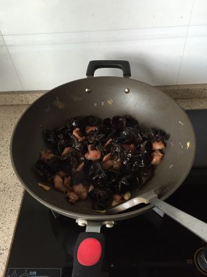 放入胡萝卜片和黑木耳,翻炒2分钟。