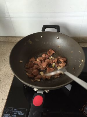 油热将葱姜蒜末煸香,放入准备好的里脊肉片,翻炒几下。