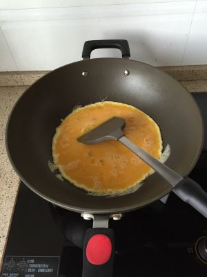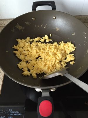 热锅凉油,打散鸡蛋液入锅,用筷子快速搅拌。