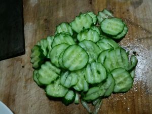 然后抓上干淀粉黄瓜切片鸡蛋打成蛋液蒜拍一下