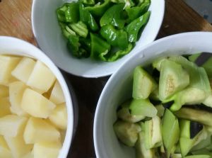 土豆切滚刀,煮六成熟过凉,茄子略煮挠起过凉,青椒切小块备用