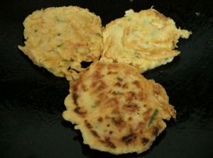 煎至两面金黄,盛入盘子,锅里留一点点油,再放入土豆饼,然后盐,鸡精,出锅前放入葱花,盛盘即可。