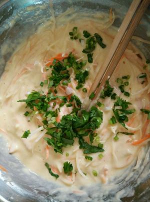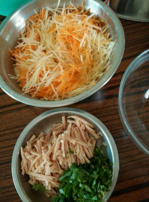 把土豆丝,红萝卜丝,火腿丝,葱,香菜加入面粉搅拌加适量盐