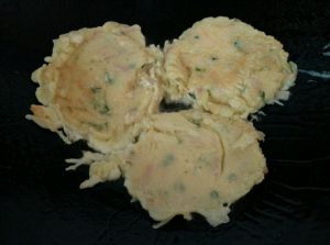 把土豆碎放进豆渣里,磕一个蛋,放葱花(不喜欢吃就不要放),放盐、味精、白胡椒粉(如果喜欢吃甜的,可以加白糖和蜂蜜)