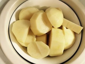 土豆去皮,切块,上锅蒸,我用的量比较少,直接放在电饭煲里用煮饭功能蒸。