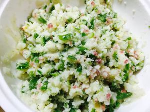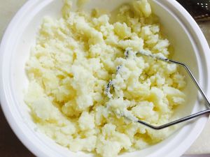 蒸熟土豆,用保鲜袋和面棍泥状,放上一个蛋和橄榄油一勺,盐、胡椒,然后拌匀。
