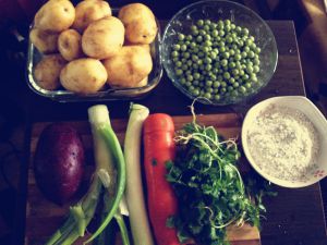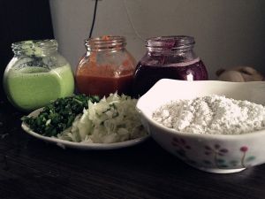 土豆煮熟捣成泥,加入生粉,大葱,和香菜,以及你想要加的颜色,