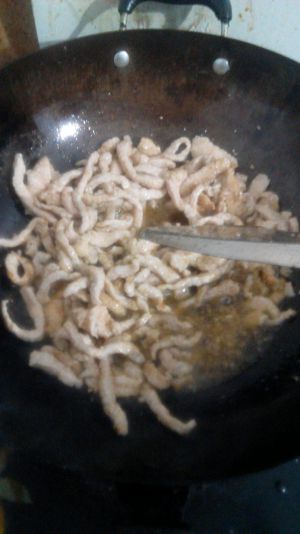 起油锅,油稍微多一点,大火烧热后,放入腌好的肉丝,快速滑熟,将肉丝捞出备用。