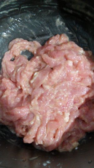 肉切丝,用料酒、生抽、食盐、生粉、1个鸡蛋清腌制5分钟