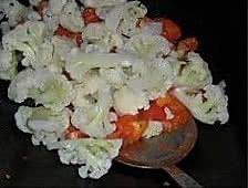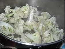 烧一锅开水,水开后,放入菜花,放少量盐,把菜花烫8分钟; .