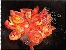 西红柿洗净,去皮切成小块。油锅七成热,放西红柿翻炒,放些白糖,调和酸味,不断按压西红柿,变成糊状。