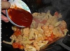 炒锅放油,五成热时候放入葱蒜放入菜花番茄酱翻炒至所有菜花都裹上番茄酱出锅