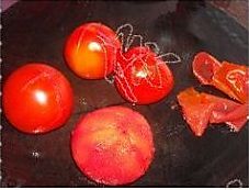 番茄地步花十字刀花,放进水里煮开后再煮1分钟,捞起用凉水浸泡,撕去外皮,切块