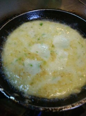平底锅倒入色拉油,热锅,下饼浆,记住油要多。
