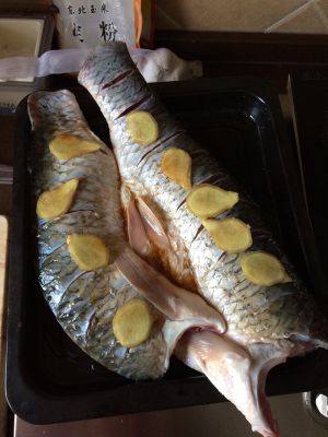 自己回家再收拾一下 我看着鱼头不舒服 就去掉鱼头了 也可以不去掉 然后从中间劈开 也可不劈断 因为烤盘放不下 就弄成两半 用刀在鱼身划几下 便于入味 用料酒 酱油 盐 胡椒粉 姜片将鱼腌大概半个小时
