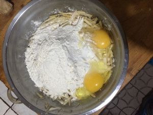 把碾好的土豆泥和鸡蛋加入盐放入事先准备好的菜里拌匀!可以下手哦,不过一定把手洗干净了(注意卫生哦)不要放太多盐哦,火腿中本身就是咸的